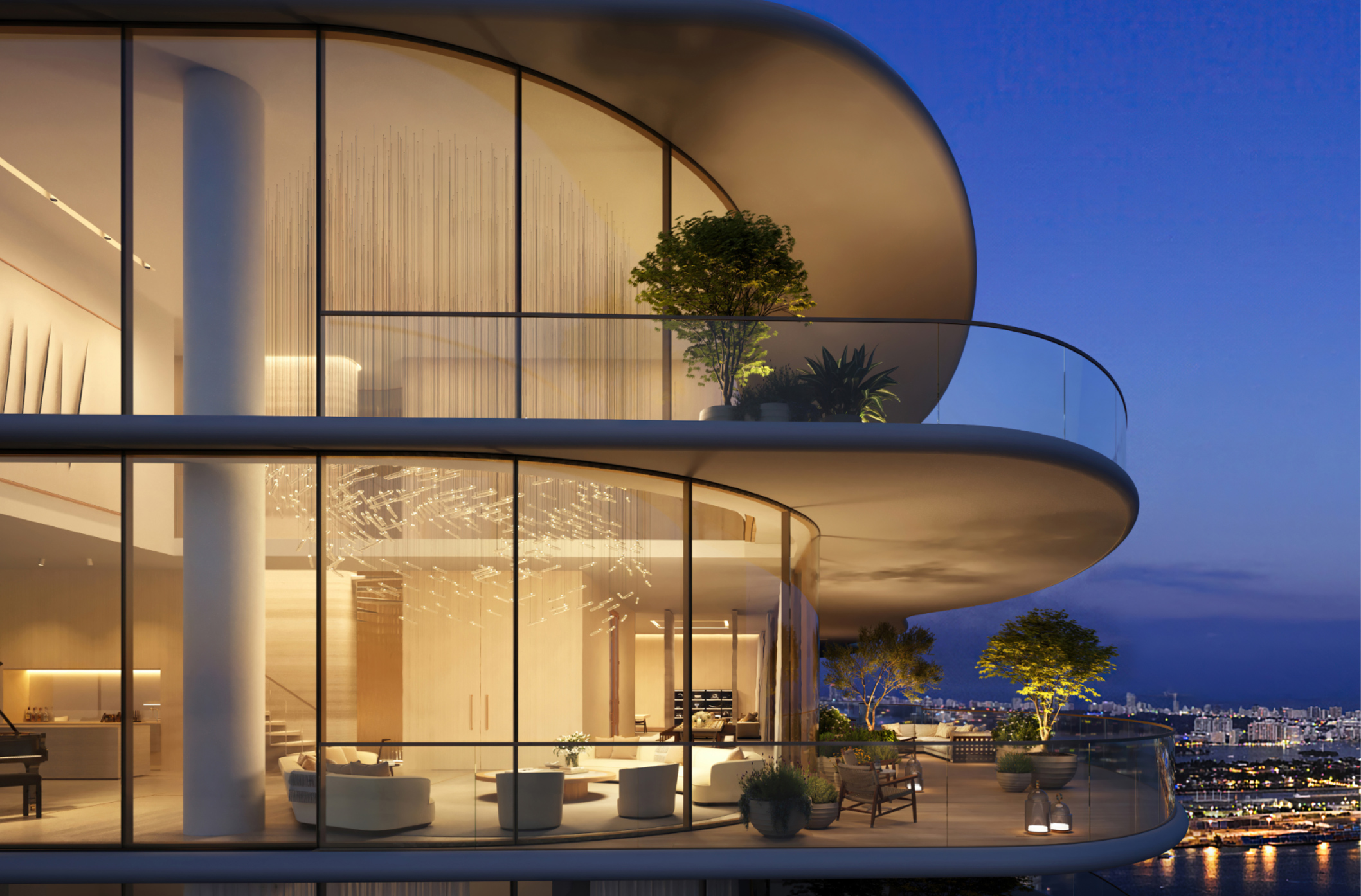It’s deliberate choices to invest in Arclinea kitchens paired with a full Gaggenau appliance suite, which can be two to three times more costly than typical specifications. It’s the massive concrete shear walls between units that improve acoustic isolation. It’s the first-ever use of Optigray technology in the building’s exterior glass, a truly postless railing system on terraces that doesn’t impact views, and an artistic bronze inlay in the travertine floors of every residence. Those are not brochure upgrades. They impact your daily life and the long-term value of the residence.